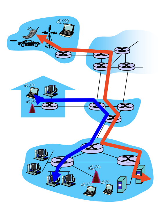 상호 연결된 네트워크 장비(라우터 => packet switching, 교환기 => circuit switching)으로 구성되어 있다.