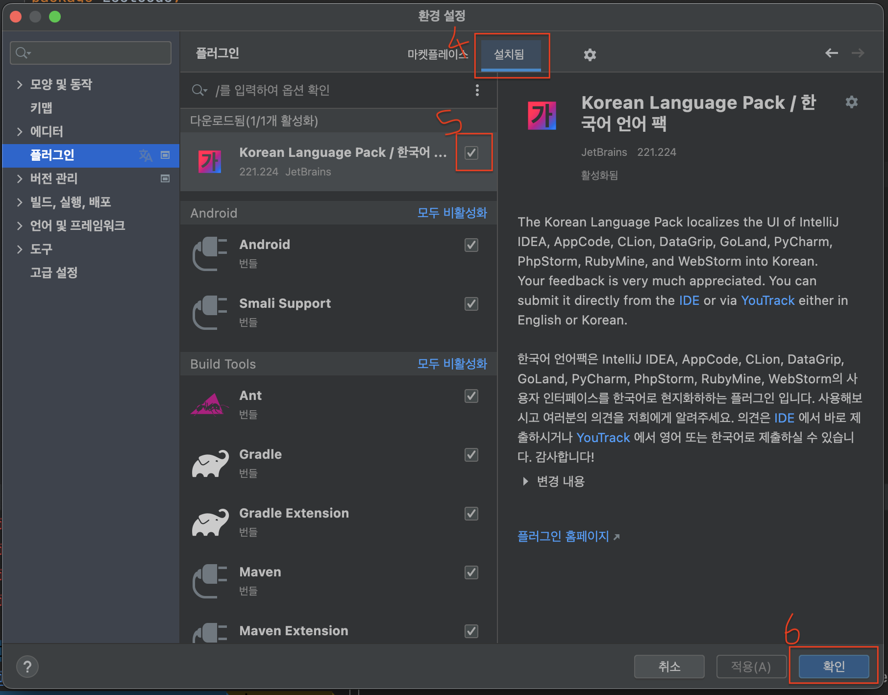 완료를 선택하시고 Intellij를 다시 시작해주면 Intellij 언어 설정이 영문으로 변경됩니다.