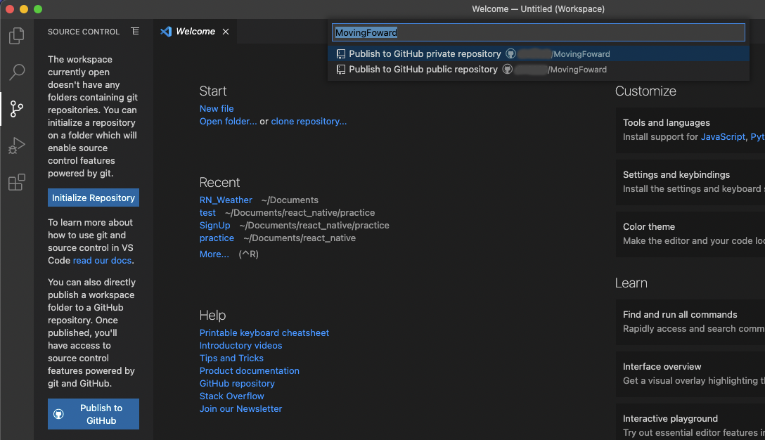 Publish to Github 아이콘을 선택하면 아래 이미지와 같은 화면이 나타나게 됩니다.
