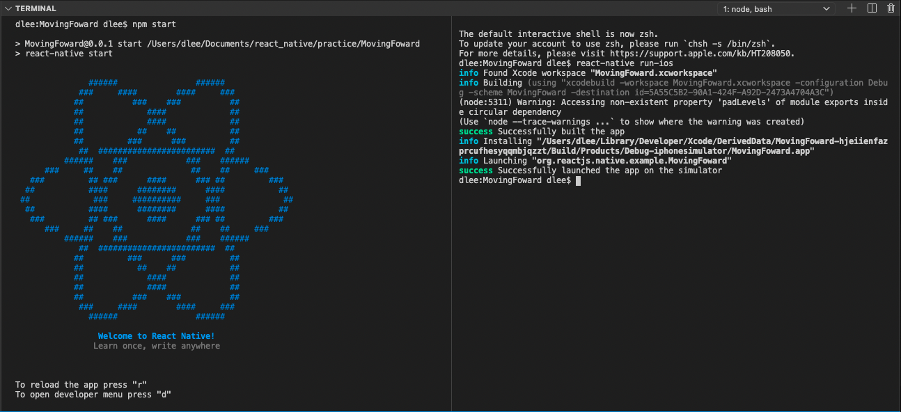 다른 터미널에서 아래 명령어를 입력하면 iOS simulator 시뮬레이터가 나타납니다.